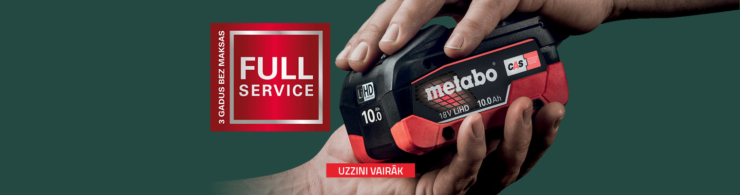Vai zināji, ka visiem Metabo bezvadu instrumentiem, kas iegādāti Stokker, mēs nodrošinām Metabo Full Service pakalpojumu? Tā ir bezmaksas remonta garantija veselus 36 mēnešus, kas nozīmē, ka visi bojājumi neatkarīgi no tā, vai tie notikuši lietotāja vainas dēļ, negadījuma rezultātā vai tiem ir ražošanas defekts, 3 gadu periodā pēc produkta iegādes tiek novērsti bez maksas.